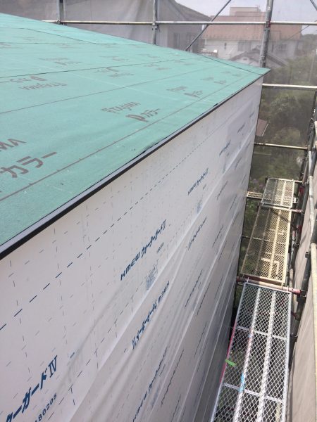 頭上では板金屋さんが噴き材の下地となる唐草という部材を取り付けます。