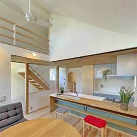2階のリビングは吹抜け勾配天井にシーリングファンも設置し室温の平準化にも寄与します。キッチンはバーカウンター付で