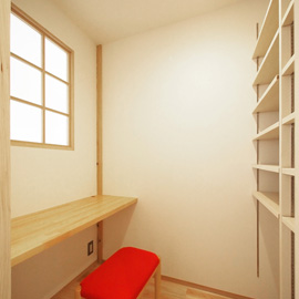 吹き抜けの格子窓から光を取り込む小さな書斎は、壁一面の書棚とスタディーカウンターが造作された落ち着く空間です。