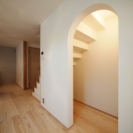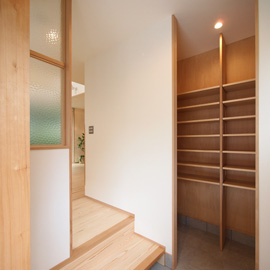 玄関を入って直ぐの壁面には古家に使われていた型硝子が明り取りとして再利用されています。十分な土間収納を備えた趣のある玄関になりました。