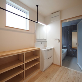 1.5坪のゆったりとした洗面脱衣室は室内物干しも兼ねています。