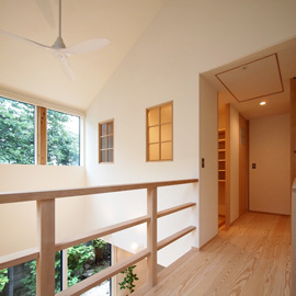 吹き抜けに面したホールは、高窓の向こうに見える隣地とお庭の緑を眺めることができる心地よい空間です。古家の型硝子を再利用した格子窓もこの空間によく馴染んでいます。