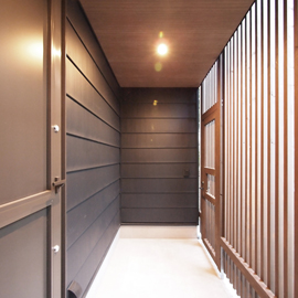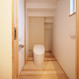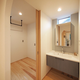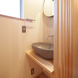 1階の玄関から格子で緩やかに仕切られた小さなスペースには、丸い鏡とボウルアクセントになっている手洗いが、その向かいにはトイレがプランされています。便利な位置にあるので帰宅して直ぐに利用することができます。