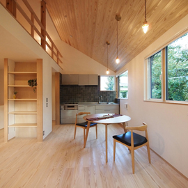 2階のリビングダイニングは、すぐ横にある緑道の借景を眺めることができる心地よい空間です。南に面しているキッチンからダイニングまでの約10帖の上部は、勾配天井でロフトまで繋がる大きな吹き抜けになっています。床板と同じ長手方向に揃えて貼られた板張り天井が、暖かみのある伸び伸びした空間を造り出しています。