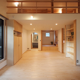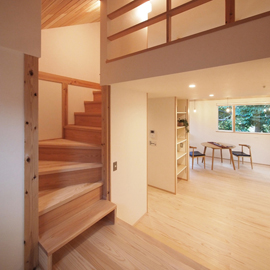 リビングの奥には小上がりで一段高くなった小部屋が用意され、ここから更にロフトへ固定階段でアクセスすることができます。この小上がりの空間は、ピアノ室の他、書斎やベンチとしても利用できる多目的のスペースです。