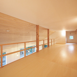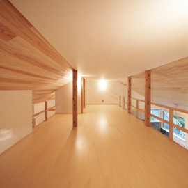 南北の吹き抜けで2階と繋がるロフトは約10帖の広々スペースです。シンプルな手摺から見下ろすと勾配天井の板張りの先に緑道の緑を臨むことができ、別荘に居るような気分にさせてくれます。