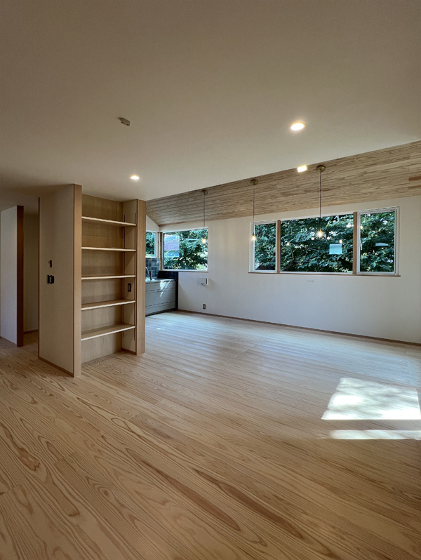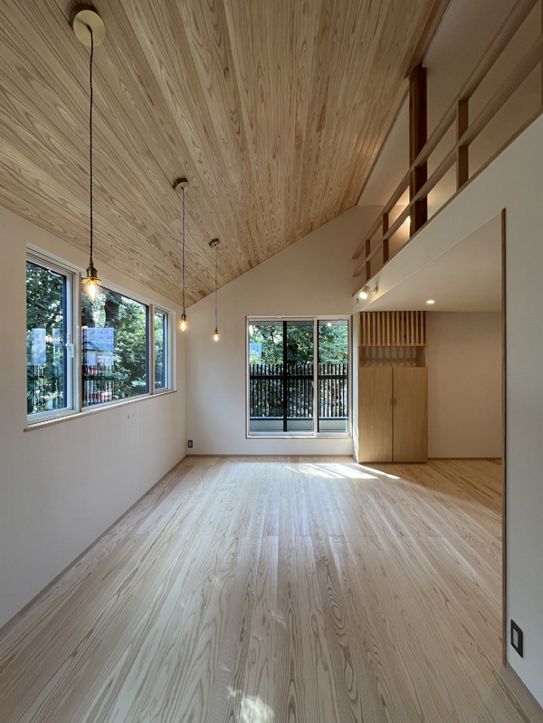 2階へ上がると、ロフトへとつながる勾配天井のLDKが広がり、横並びの大きな窓からは緑道の豊かな景色を一望できます。