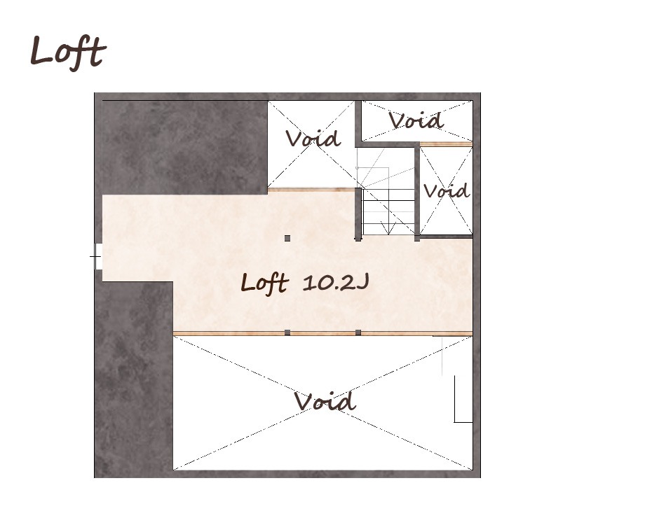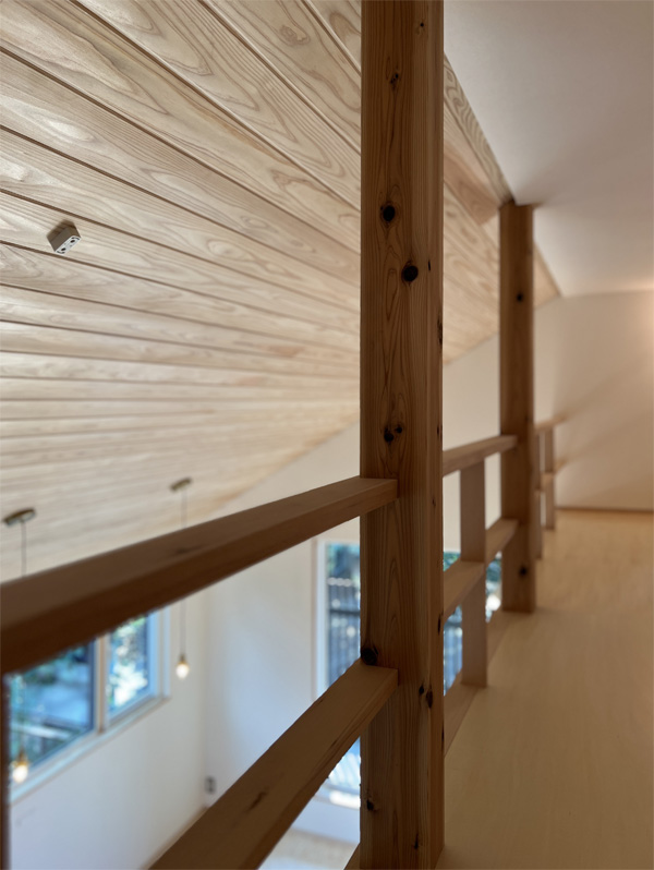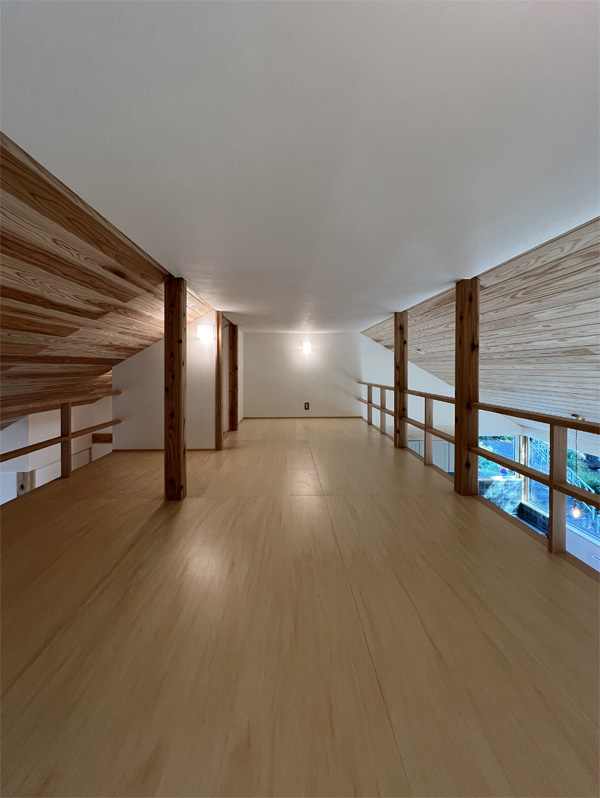 ロフトは家の中心を東西に走る形で配置され、南北側は2階とつながることで視線が抜け、開放感が生まれています。さらに、冷暖房効率の良い空間設計も魅力です。