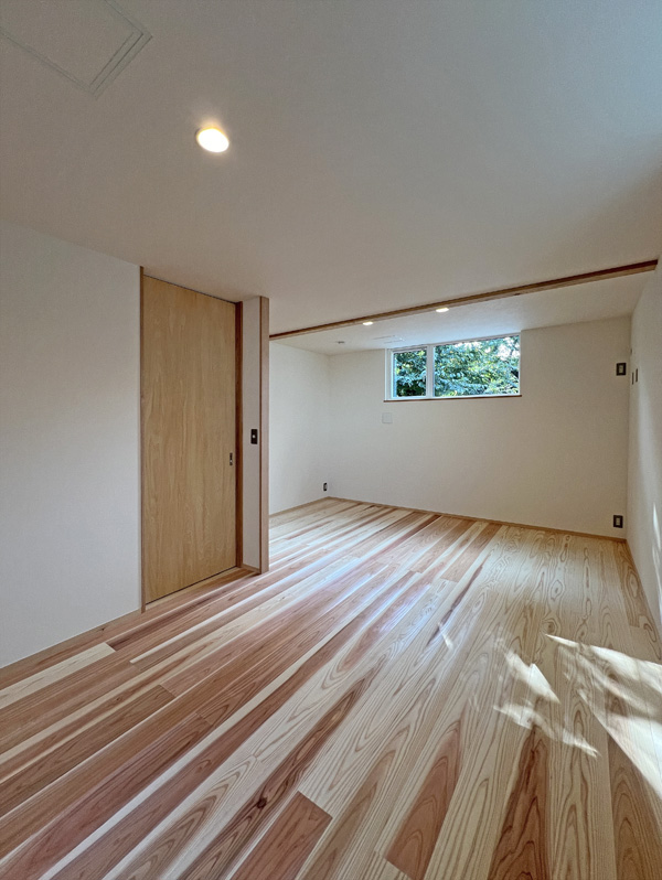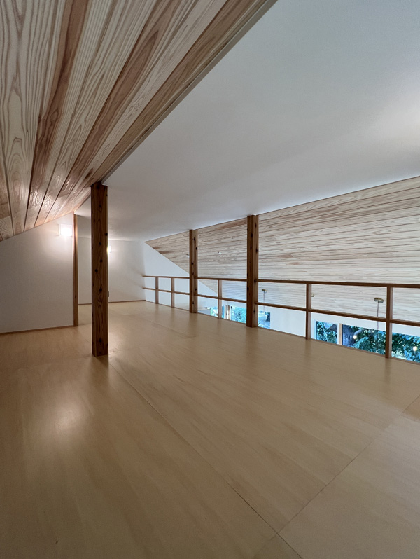 仕上げ材にもこだわりが込められています。2階の勾配天井や玄関ポーチの壁には無垢の板を使用し、ポーチの床には大谷石を採用。遊歩道の自然と調和する、温かみある素材がふんだんに取り入れられています。