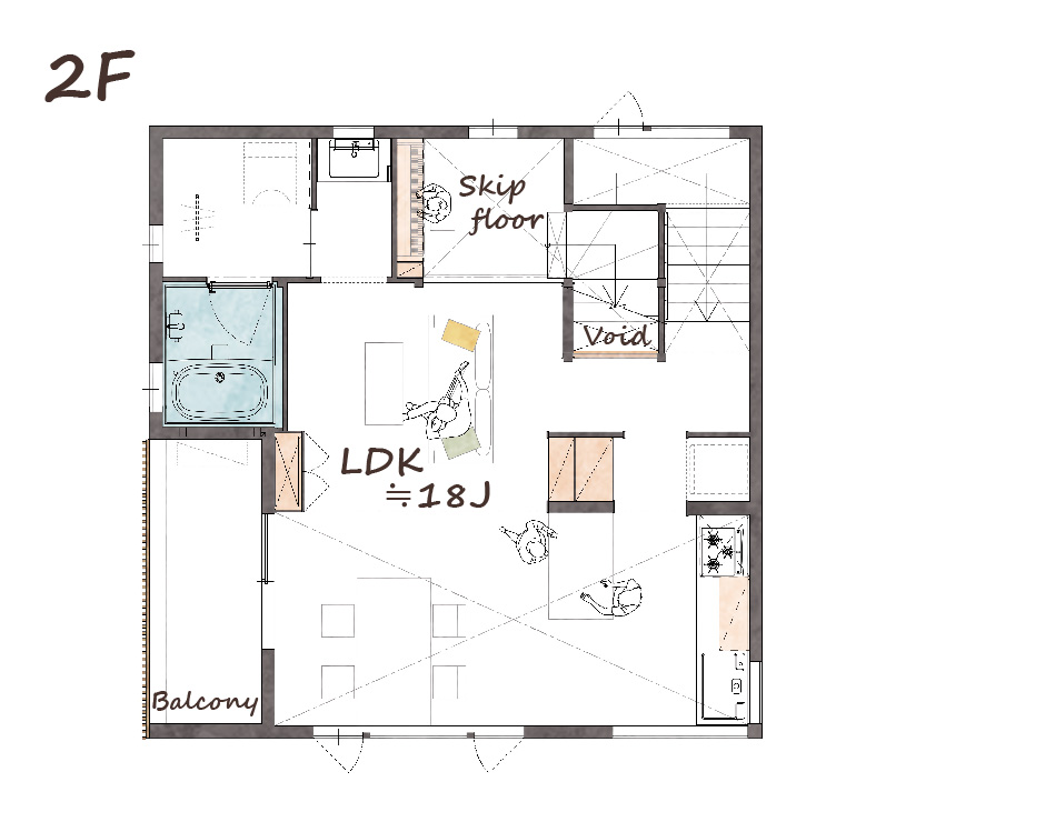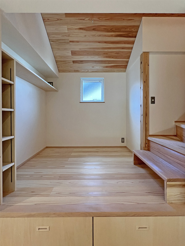 また、2階とロフトをつなぐ部分には2.5帖のスキップフロアを設け、下部を収納として活用。空間を有効活用しています。