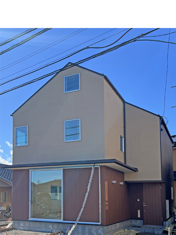 東村山市の閑静な住宅街に、塗壁と板張りの風合いが美しい、1階リビングのお家が完成します。