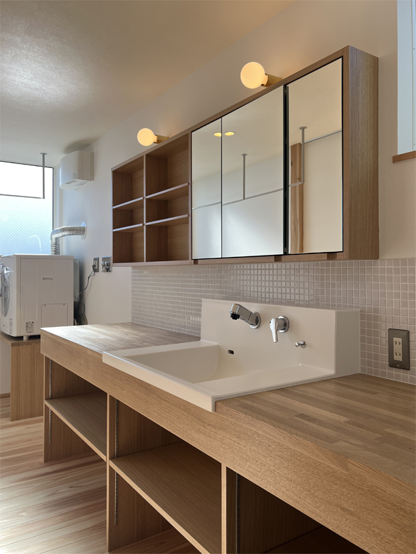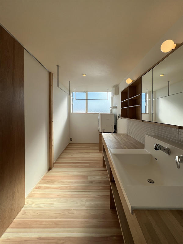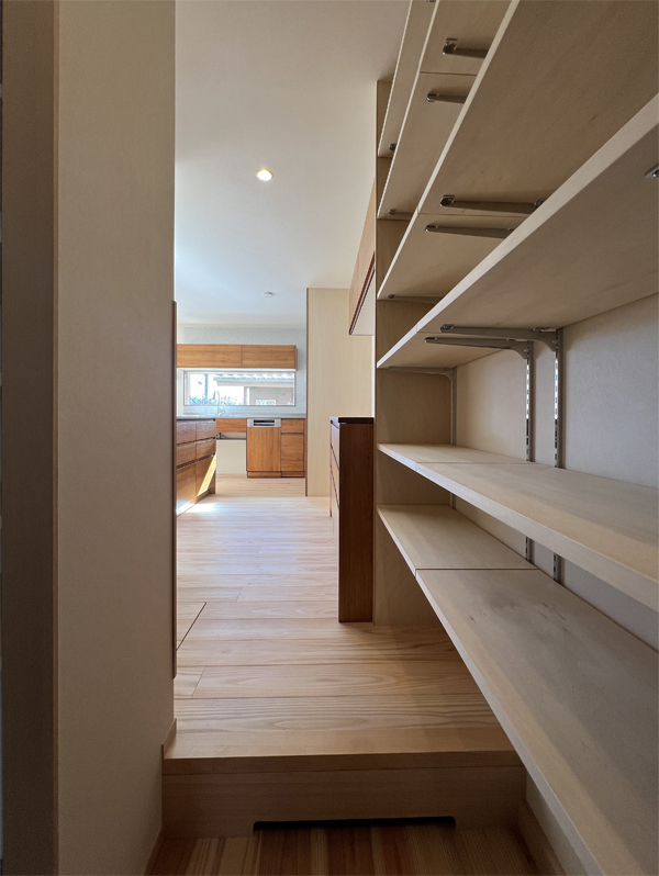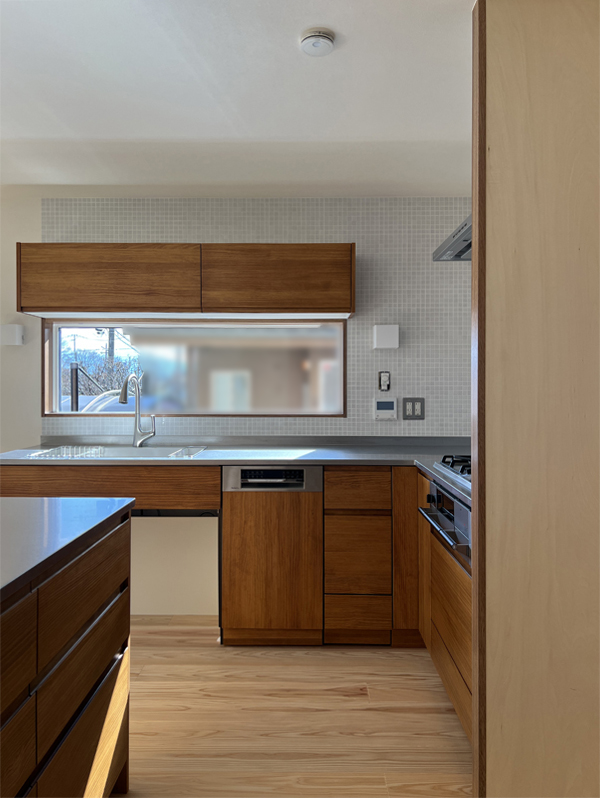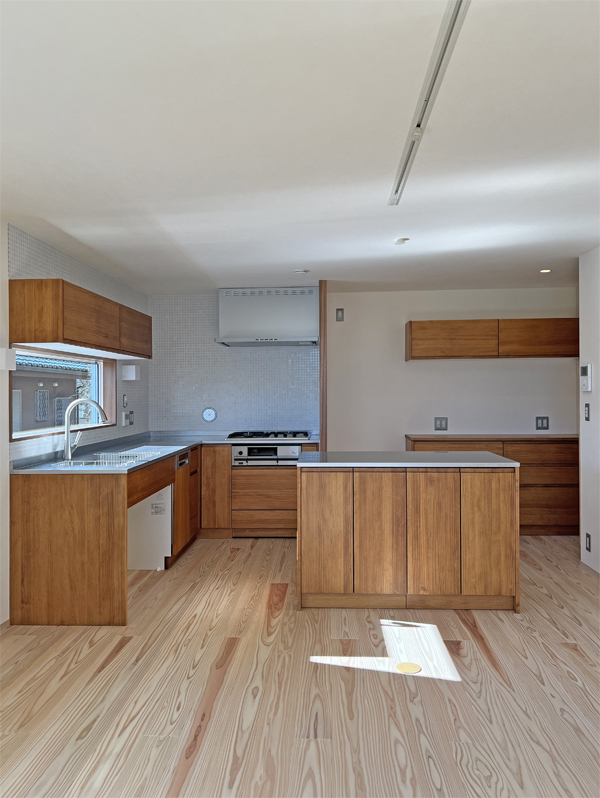 室内にはナラやラワンのカウンターや建具が使用されるなど、随所に美しい質感と風合いが感じられるお家です。