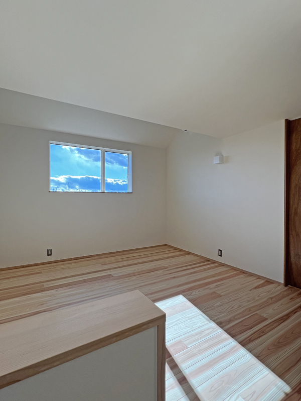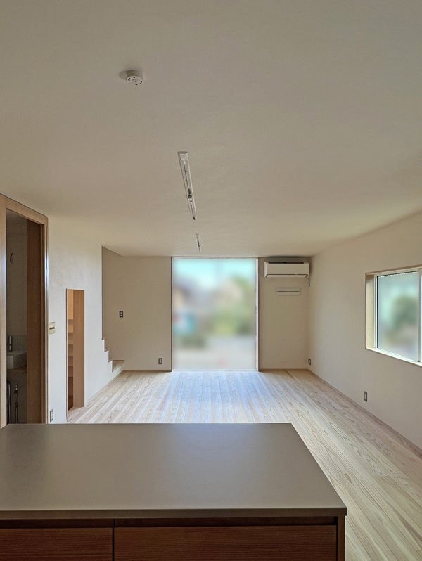 1階リビングの東面には、外の景色を切り取るような、一本引き戸の大開口サッシあります。